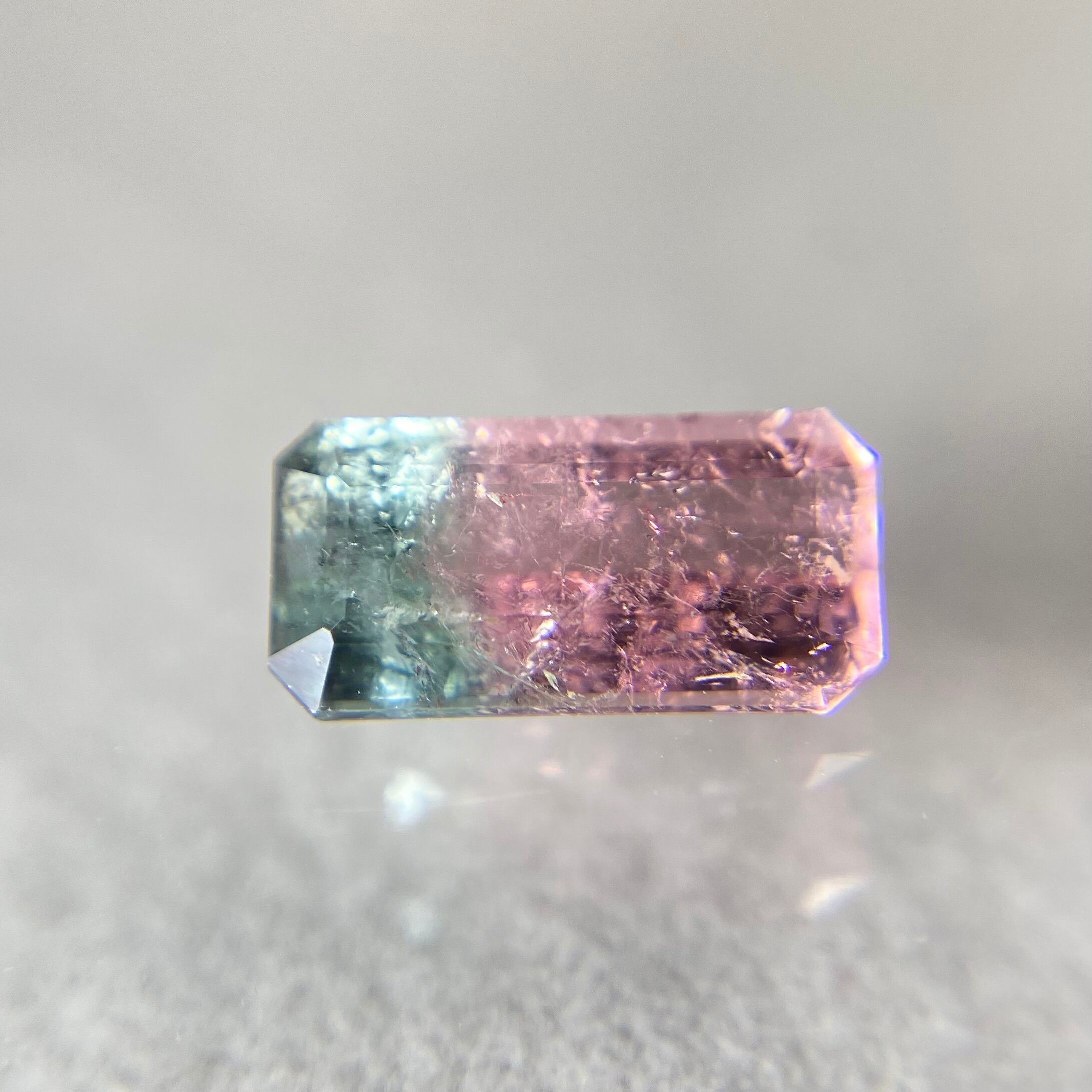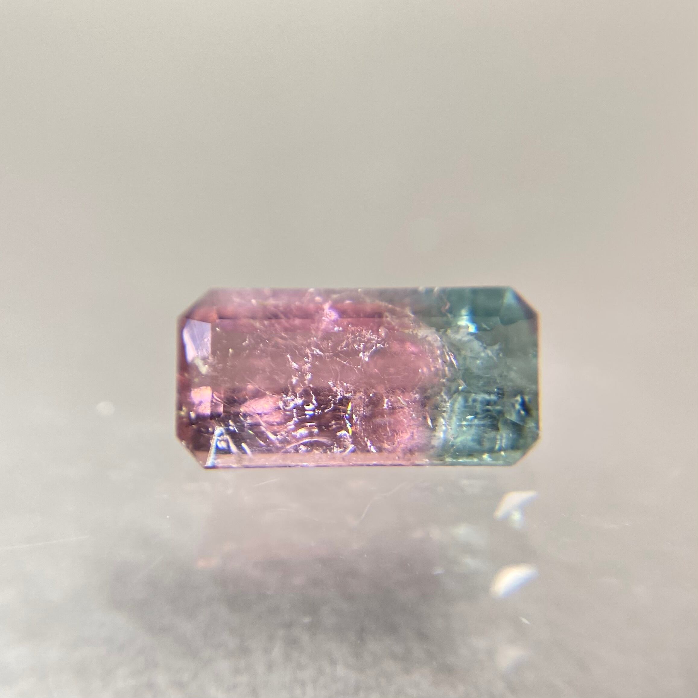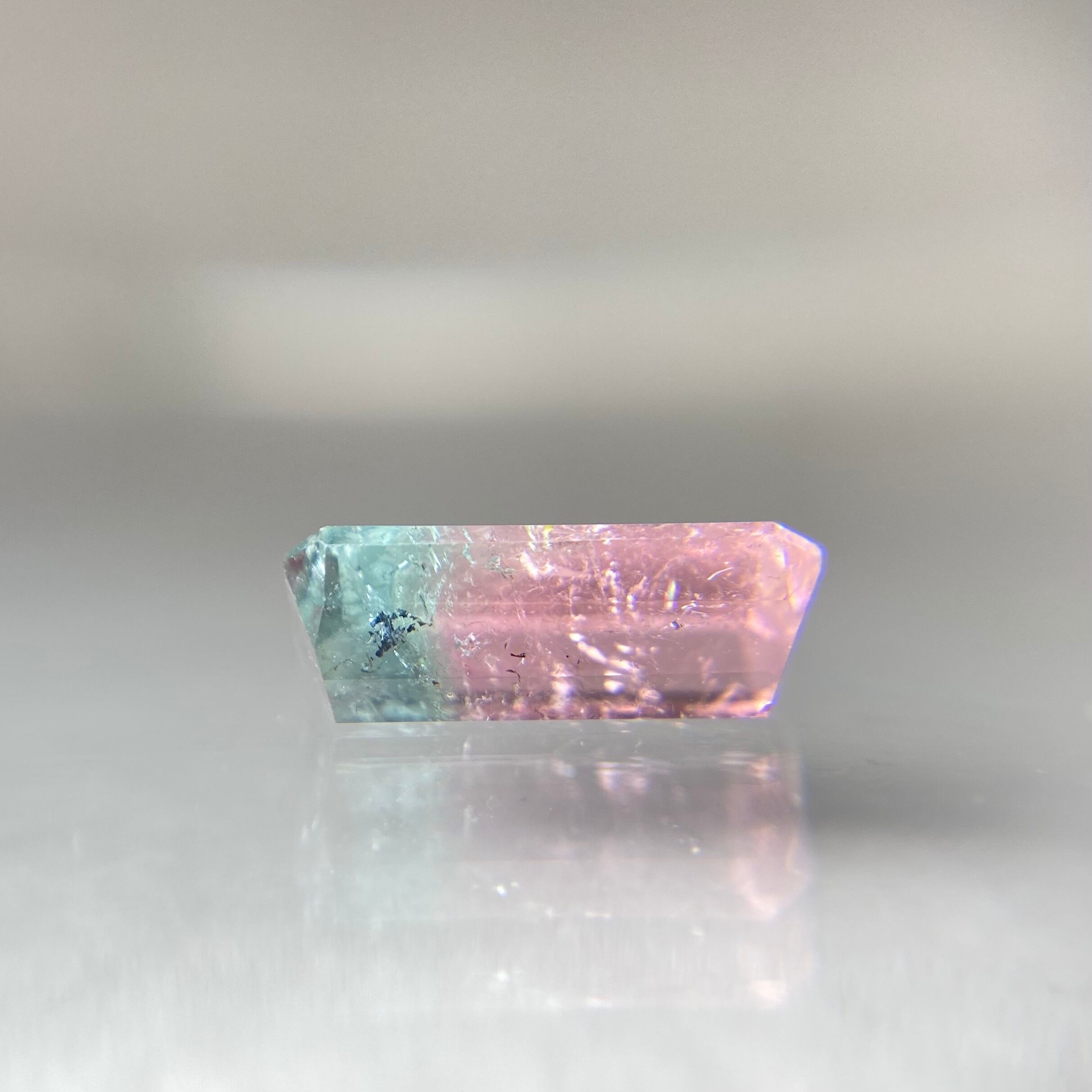 ピンクとグリーンのバイカラーとなりますが、ピンクは光の加減でオレンジみを感じたり、パープル寄りに見えたり、またグリーンもわずかに青みが感じられたりと色味がしっかりある分トルマリンの多色性を味わえるピースとなります。