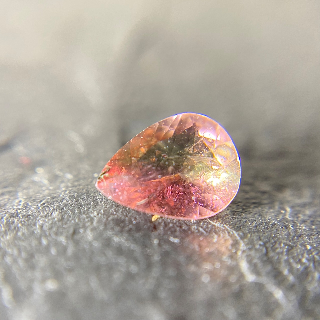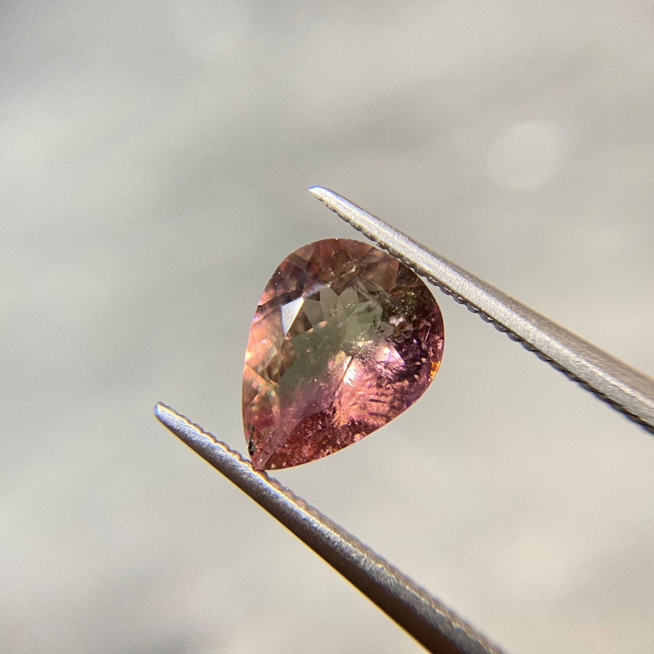こちらはオレンジ系ピンクとモスグリーンのカラーとなり、シックな色合いとなります。中央がグリーンとなり、見る向きによっては色が混じり合った一色に見えるため、バイカラー表記はしていません。ピンクの部分はくるくると回して見ると時折赤みが差す箇所もあり、シェイプの先端部分には色溜まりもあります。落ち着いた色味となり大人の香りがするピースとなります。