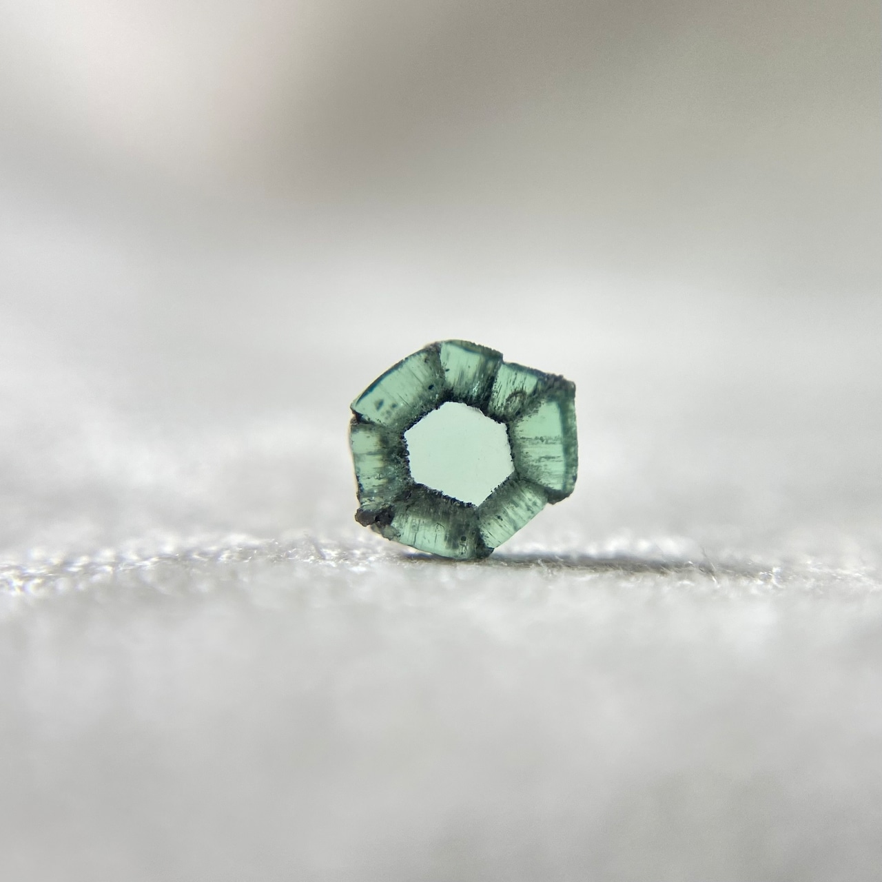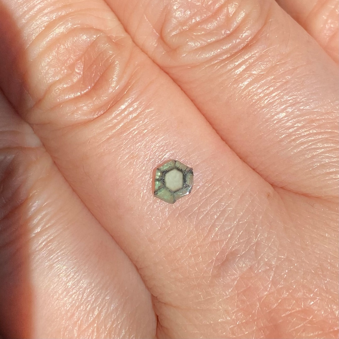 お色はモスグリーンなカラーとはなりますが、中央部分は鏡のようにクリアな六角形がみられ、厚みもあるピースです。