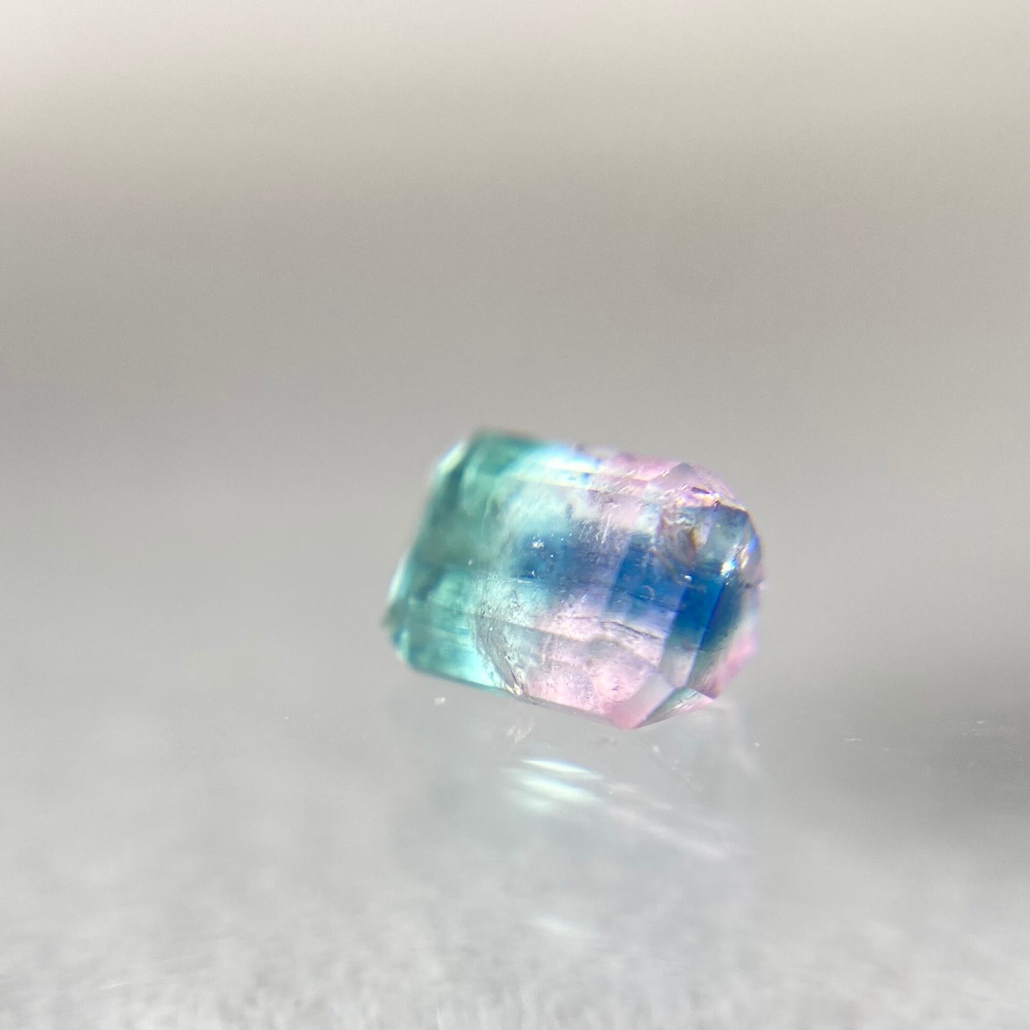 バイカラー表記にはしていますが、正面から見るともう一色が見られ、ピンク・グリーン、そしてブルーの色味が横切っています。横からの画像6枚目でお分かりいただけるように、ウォーターメロンのようになっていてブルーの結晶がピンク部分に横たわっています。そしてこのブルーはグリーンには差し込んでおらず、ピッタリとピンク部分で留まっていて、大変個性ある色使いとなるピースとなっています。