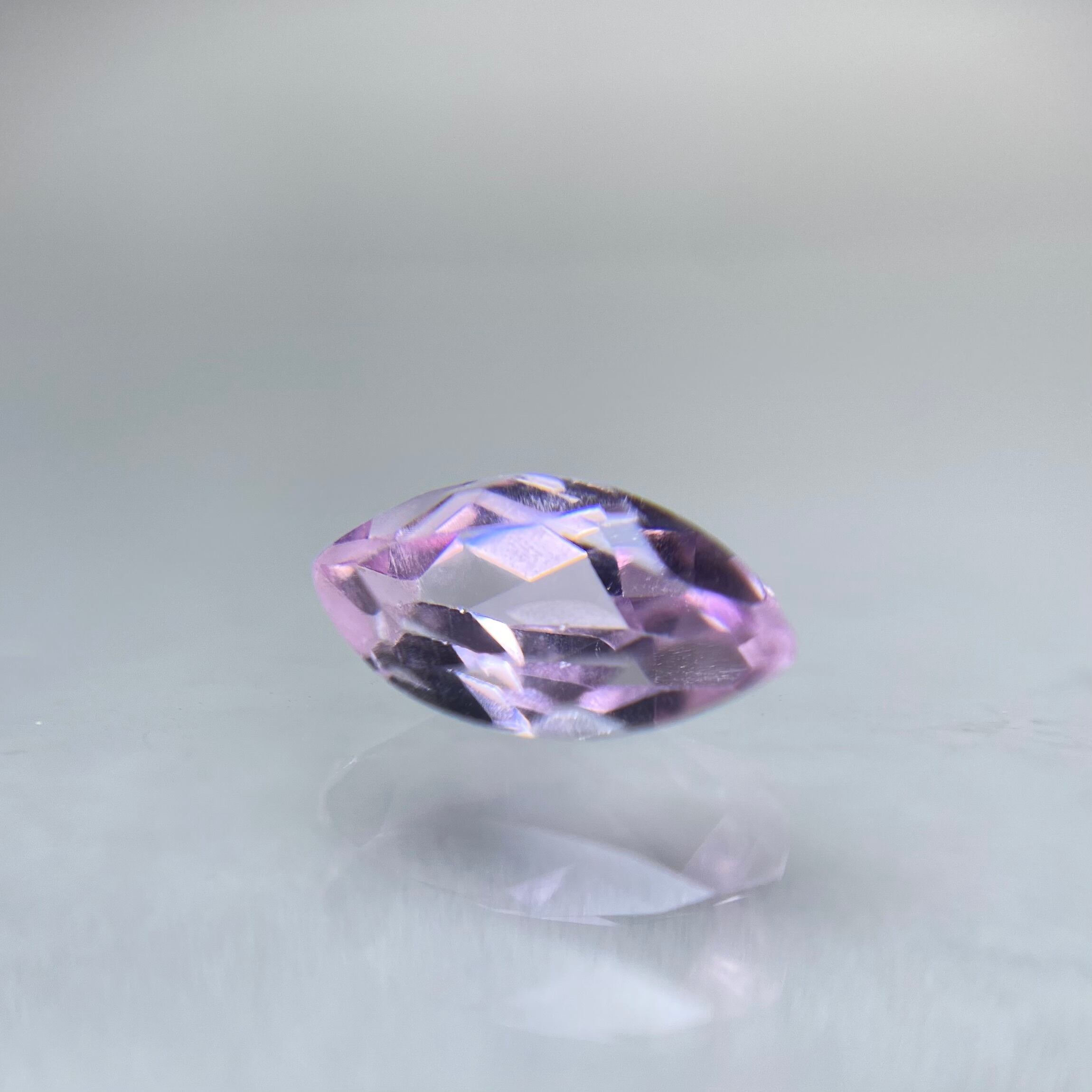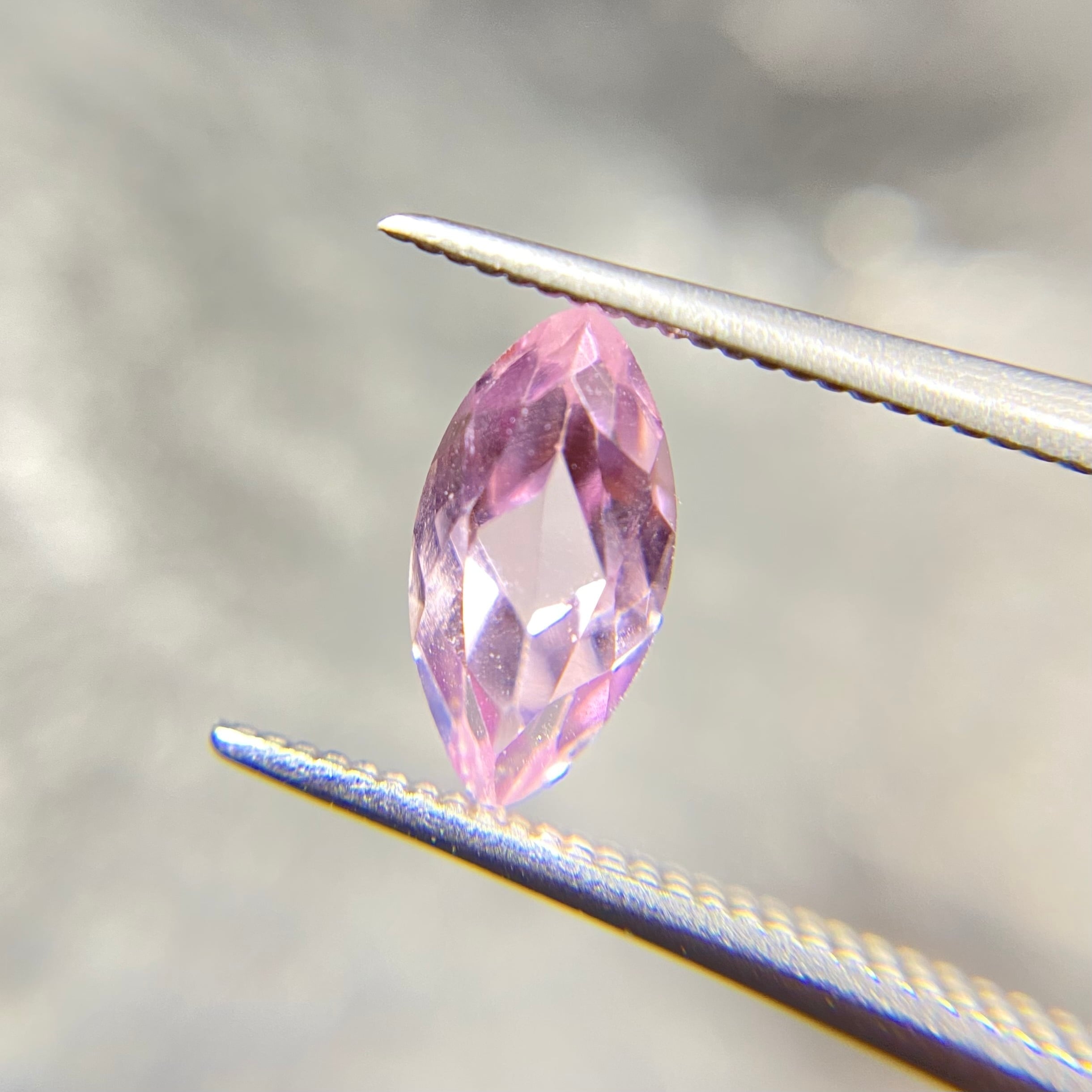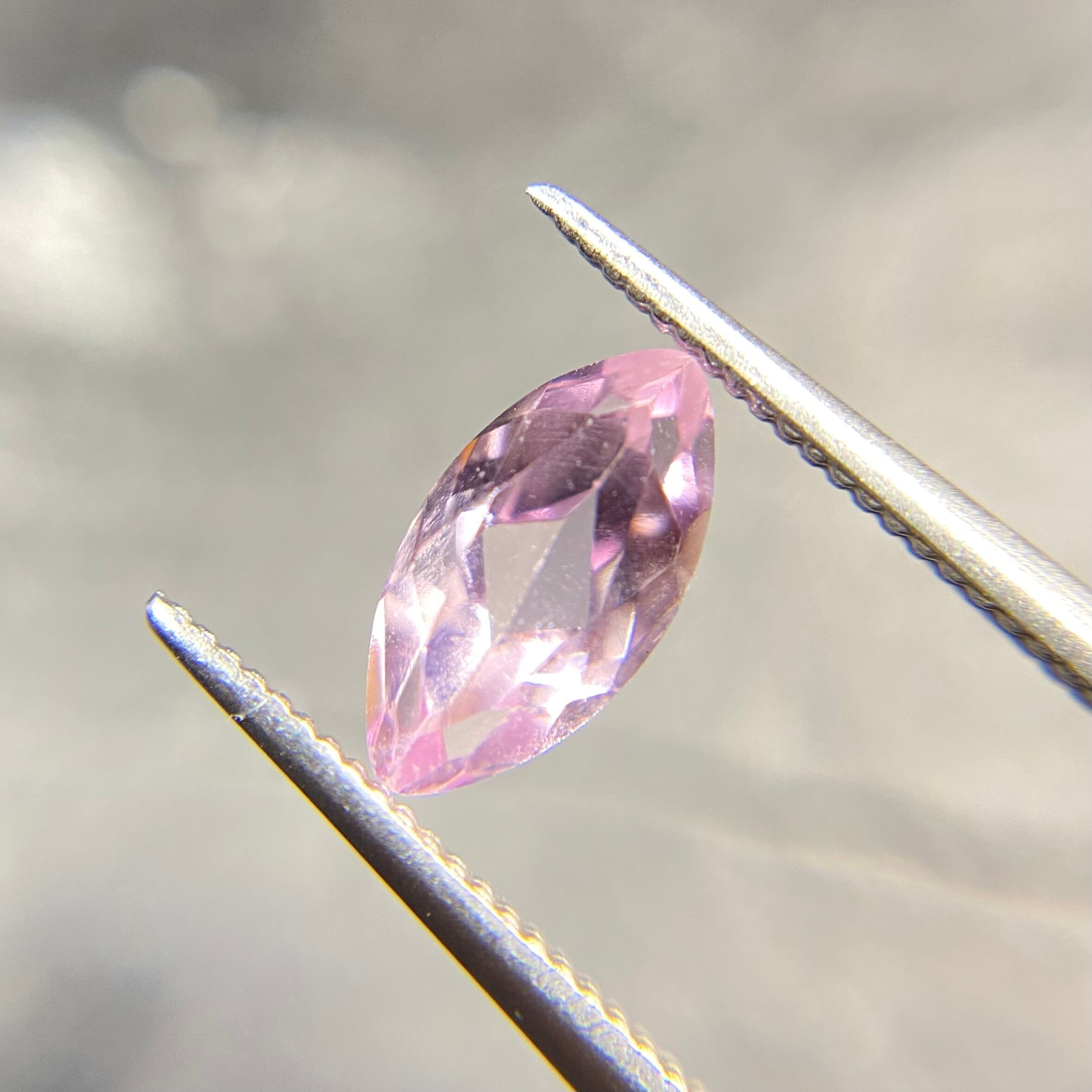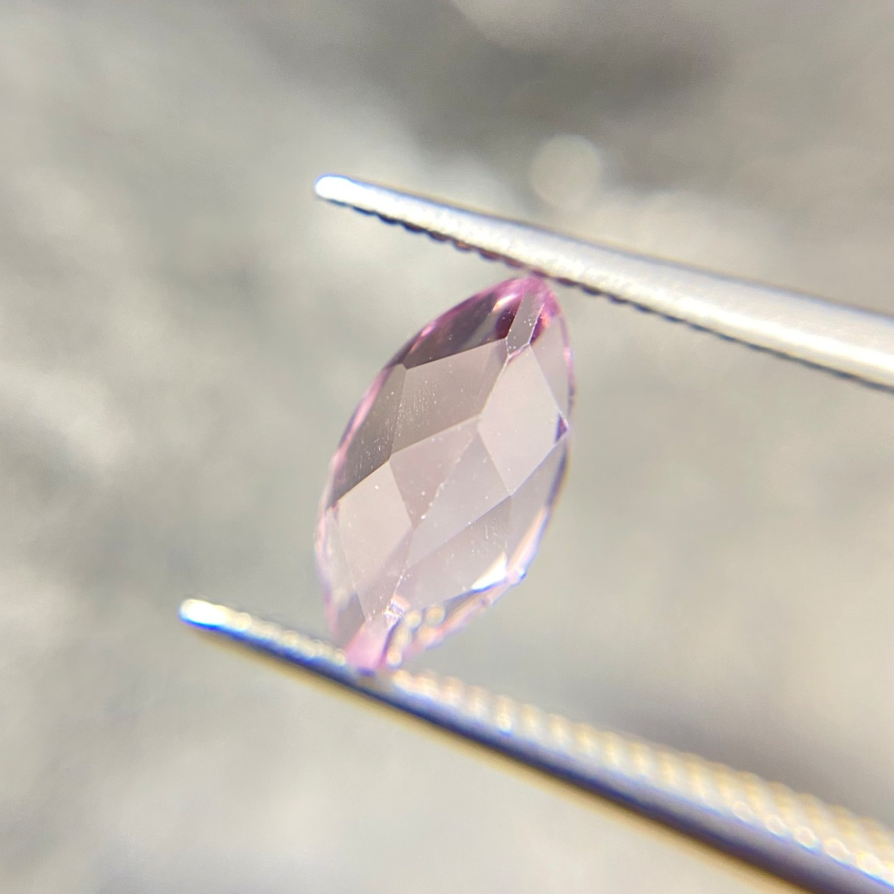 桜ピンクの可憐なルースです。マーキスカットとなるため、両端の色溜まりがご覧いただけます!