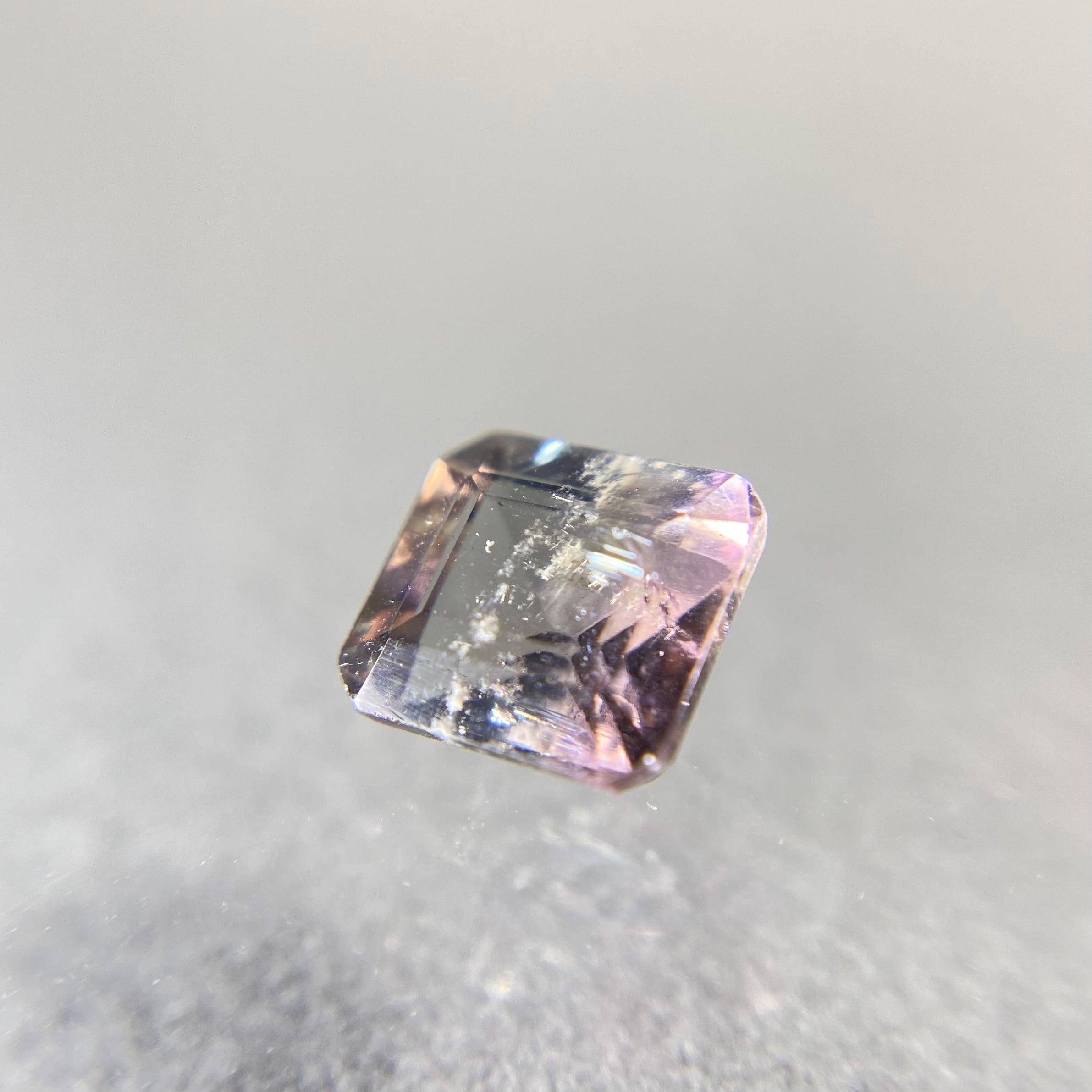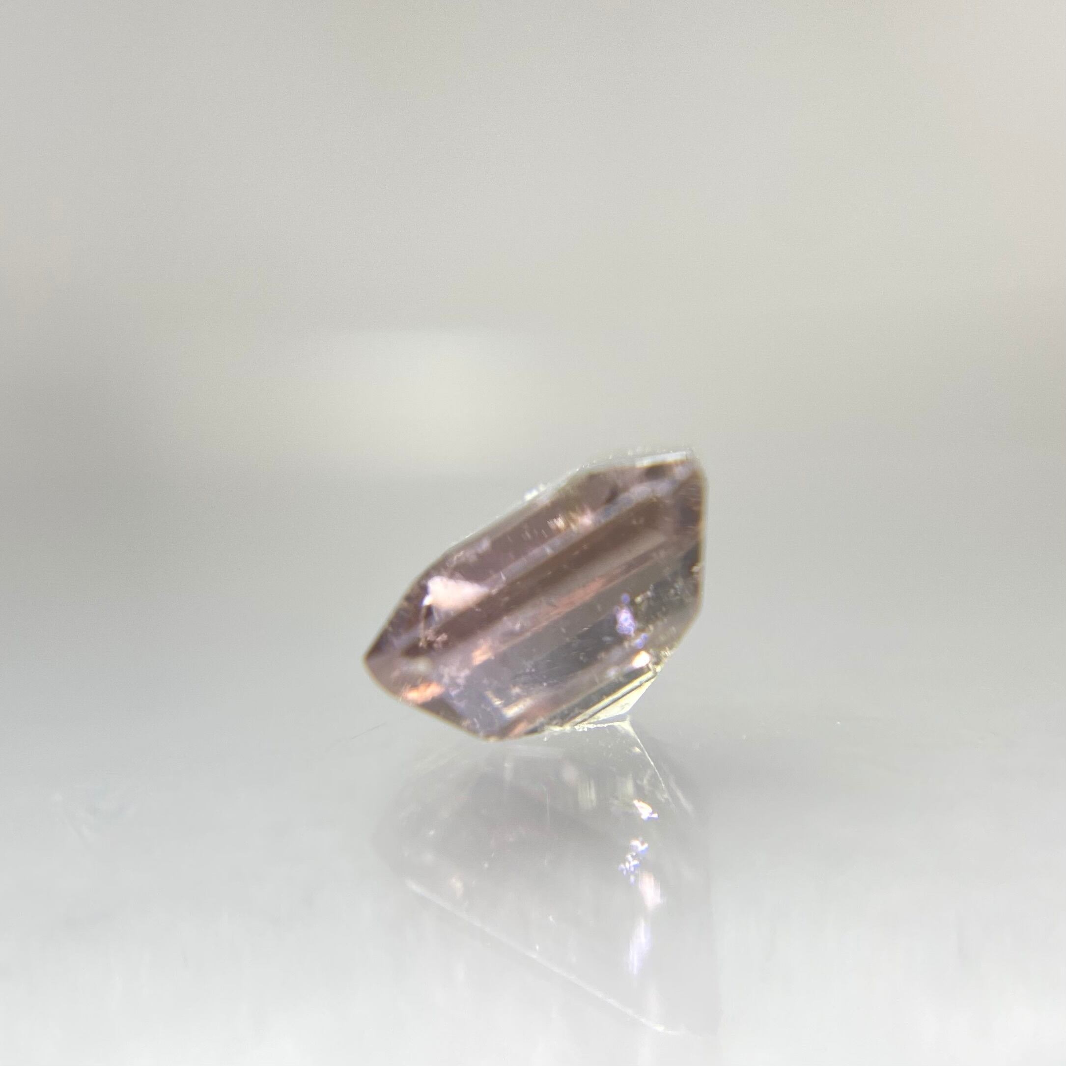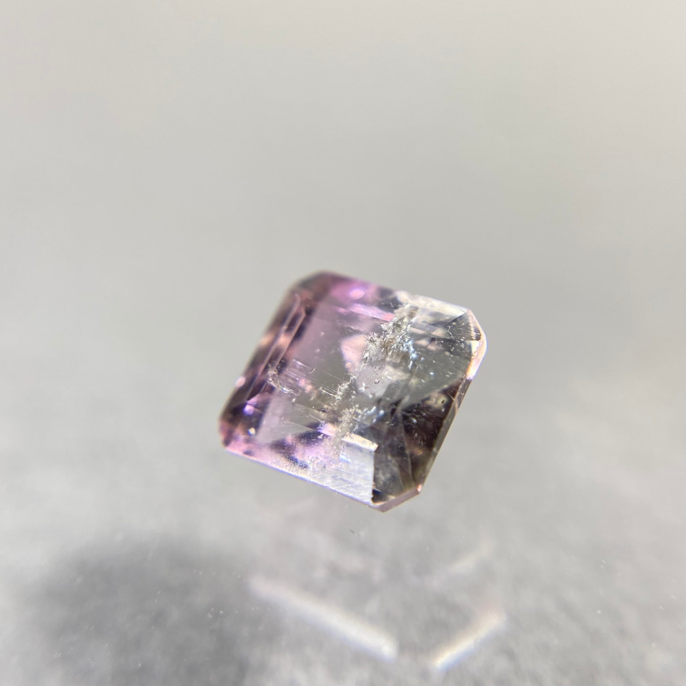 キャンディピンクと明るい場所そして角度によっては青みを感じるグレイの大人カラーが楽しめるピースです。肉眼で認識できるクラックが、そしてルーペ越しで確認できるクラックやあたり傷がありますが、欠けなどはありません。