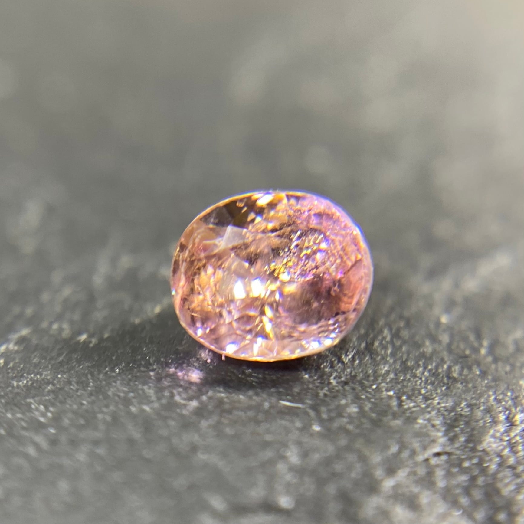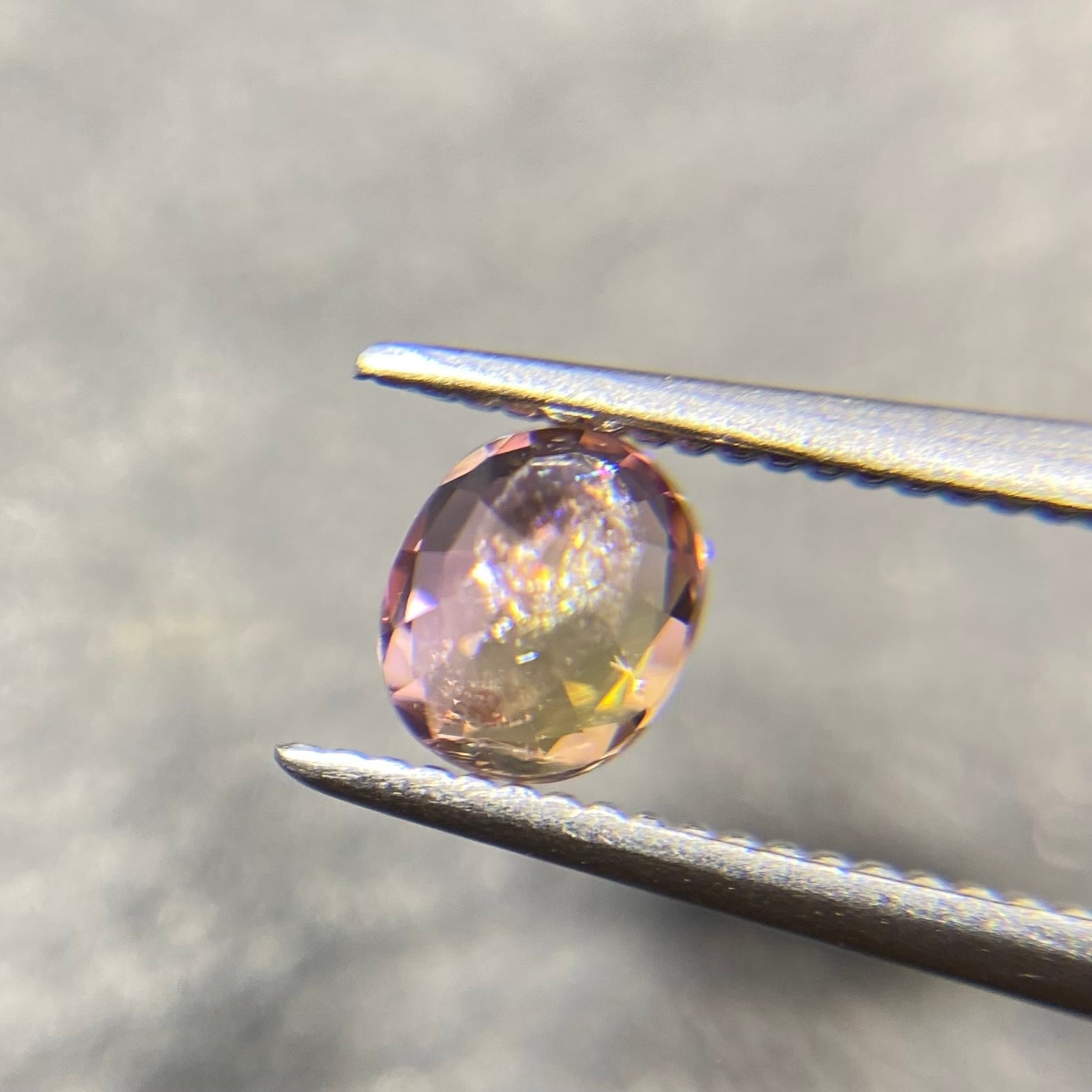 ちょっとパープルみのあるピンク、そしてもう一方も少しブラウンを噛んだようなオレンジの色合いが入っているため、見る向きによってそれが複雑に混ざり合い、珍しいゾイサイトの色味となっています。ルースケースから出して光を浴びるとその繊細な色合いに照りが加わってとても可憐な雰囲気となります。