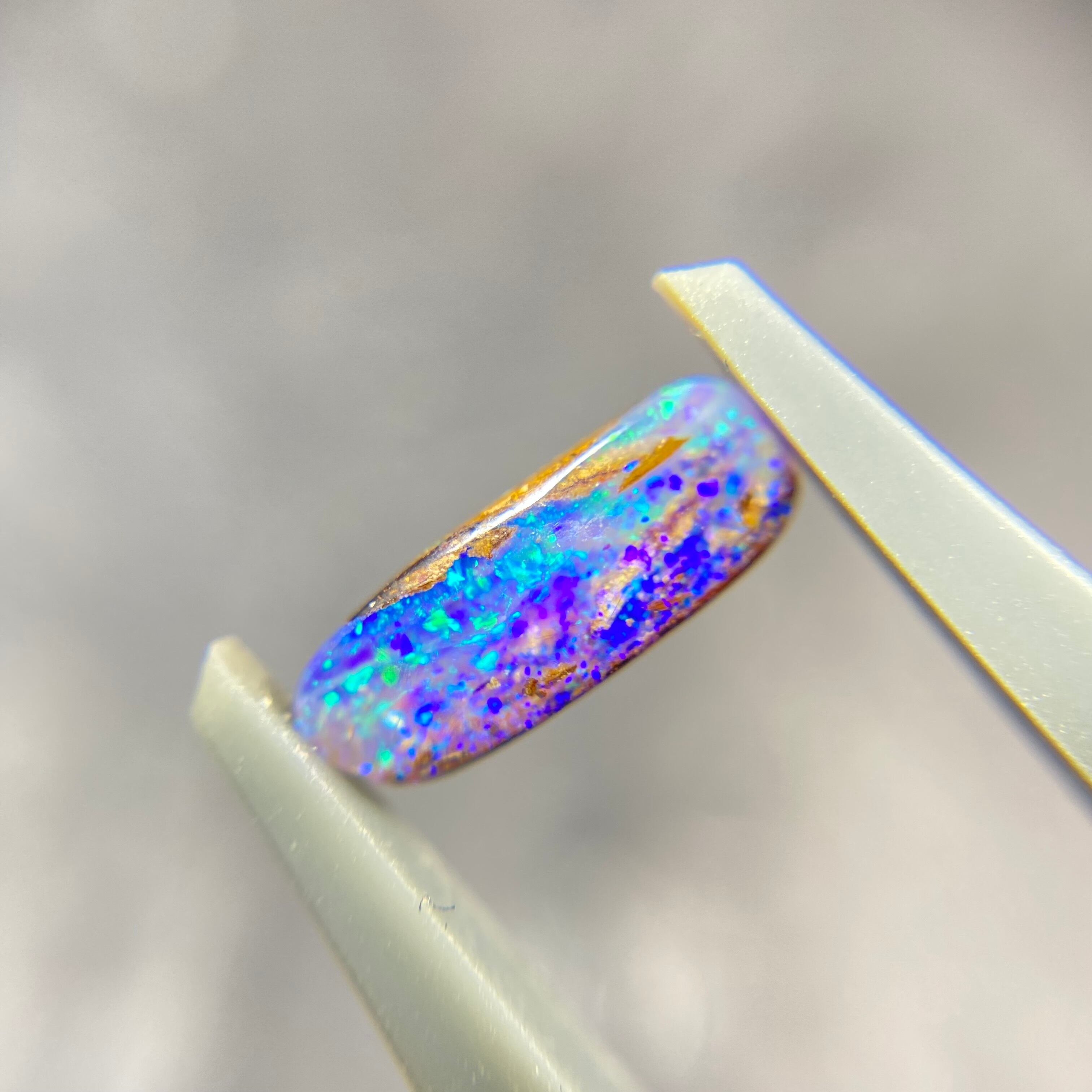 ブルーだけでなく、バイオレットやグリーン、時折垣間見えるピンク…カラーレスの箇所もあるためとても透明感と奥行きを感じさせてくれる時間泥棒のオパールです。こちらも裏側は大きめなオパール化した箇所が表れており、ブルーやグリーンなどの色味を垣間見ることができます。画像や動画でも捉えきれない美しい遊色を是非お手に取ってご覧ください。