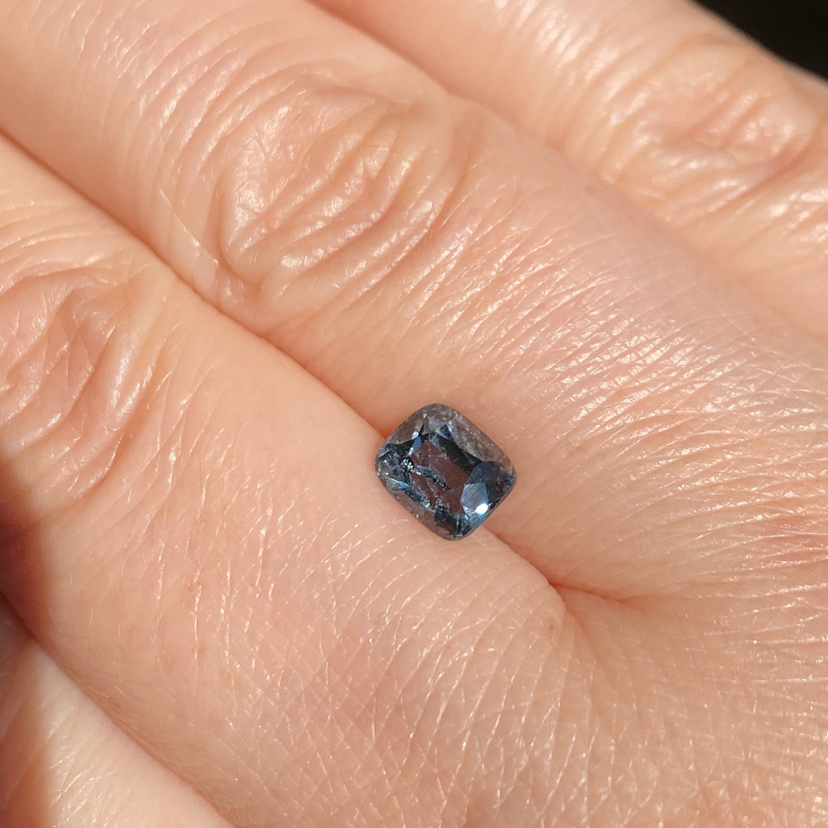 暗めの場所だとグレイッシュ、通過光だとブルーみが増すスピネルです。メタリックな輝きがとても美しい!