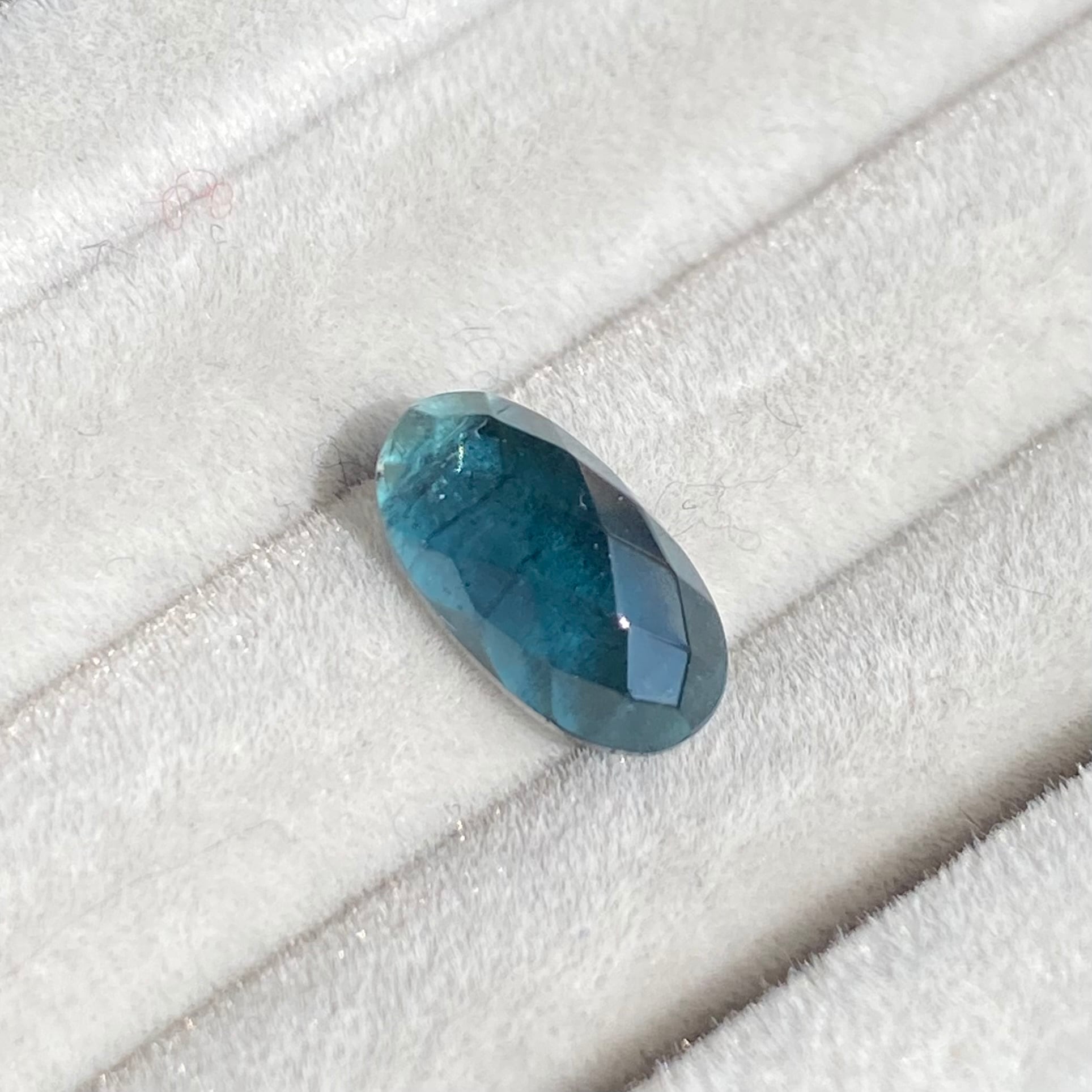 とても深いブルーですが、下にスマホの画面を置いて通過光で見るとかすかなグリーンも感じます。そして片側端はうっすらとしたカラーレスとなっています。暗い場所などでは黒みを感じますが、日差しを浴びると広がる美しいブルーを楽しめるピースです。