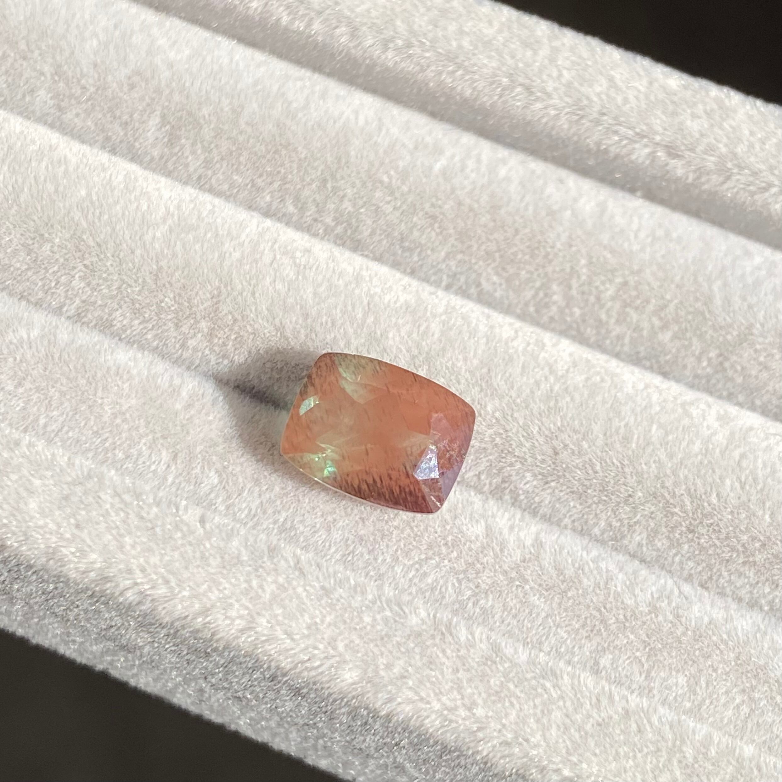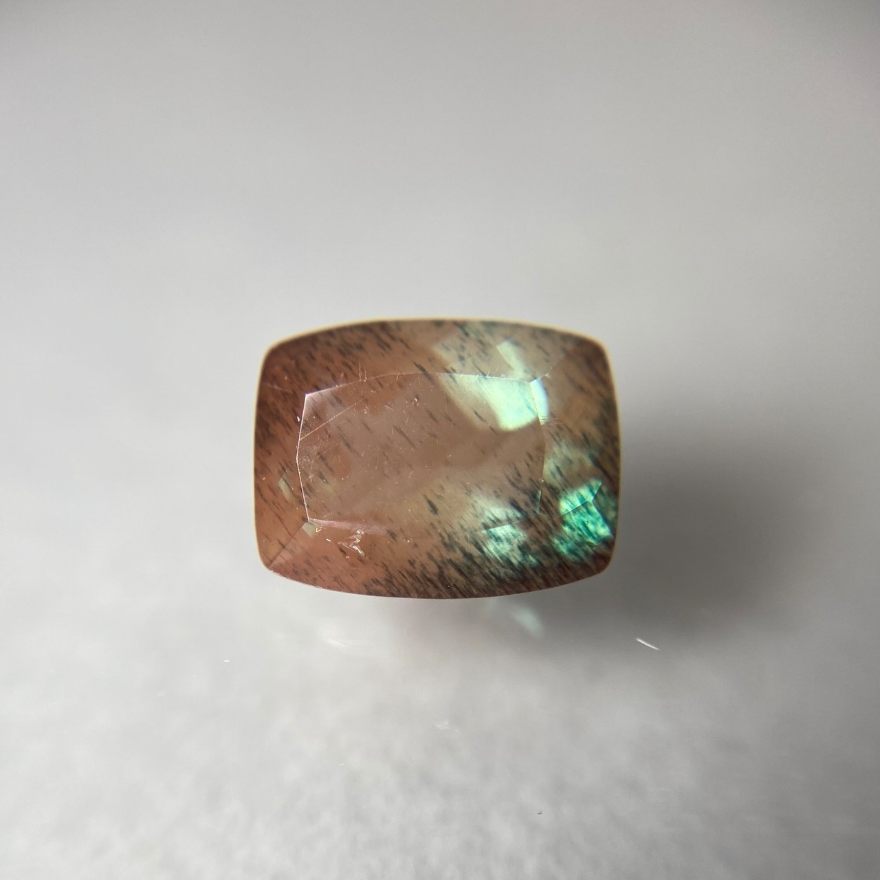 ラブラドライトやサンストーンと同じ鉱物グループとなる長石の一種です。銅由来と言われるオレンジ系カラーの中に、妖しげに光るグリーンのゆらめきを見ることができます。