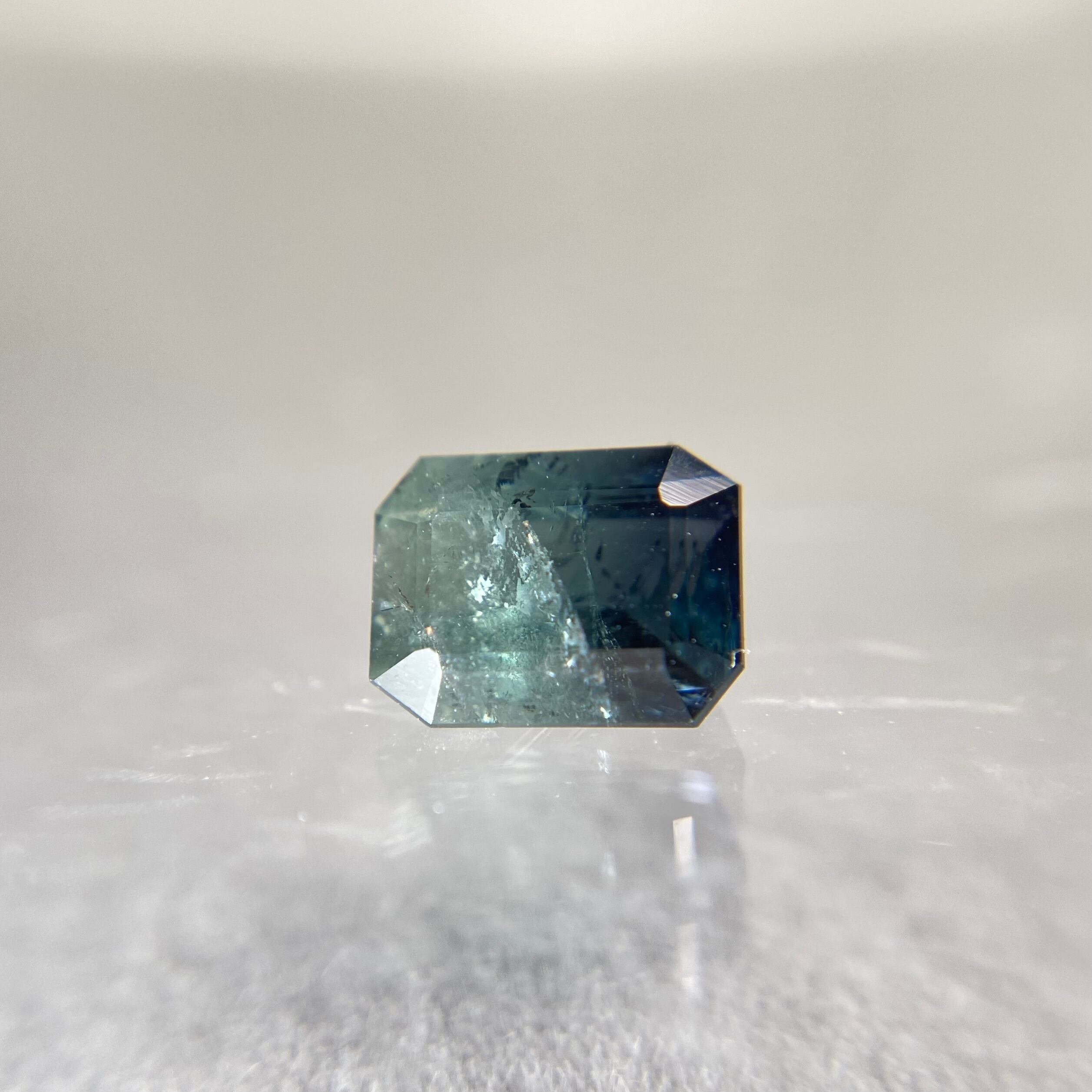 こちらは面白い色の分かれ方をしているバイカラートルマリンです。グリーンの濃淡となるバイカラーのように見えますが、光を通して見ると濃い部分には青みも感じます。肉眼でわかるクラックはありますが、目立つ欠けなどはありません。